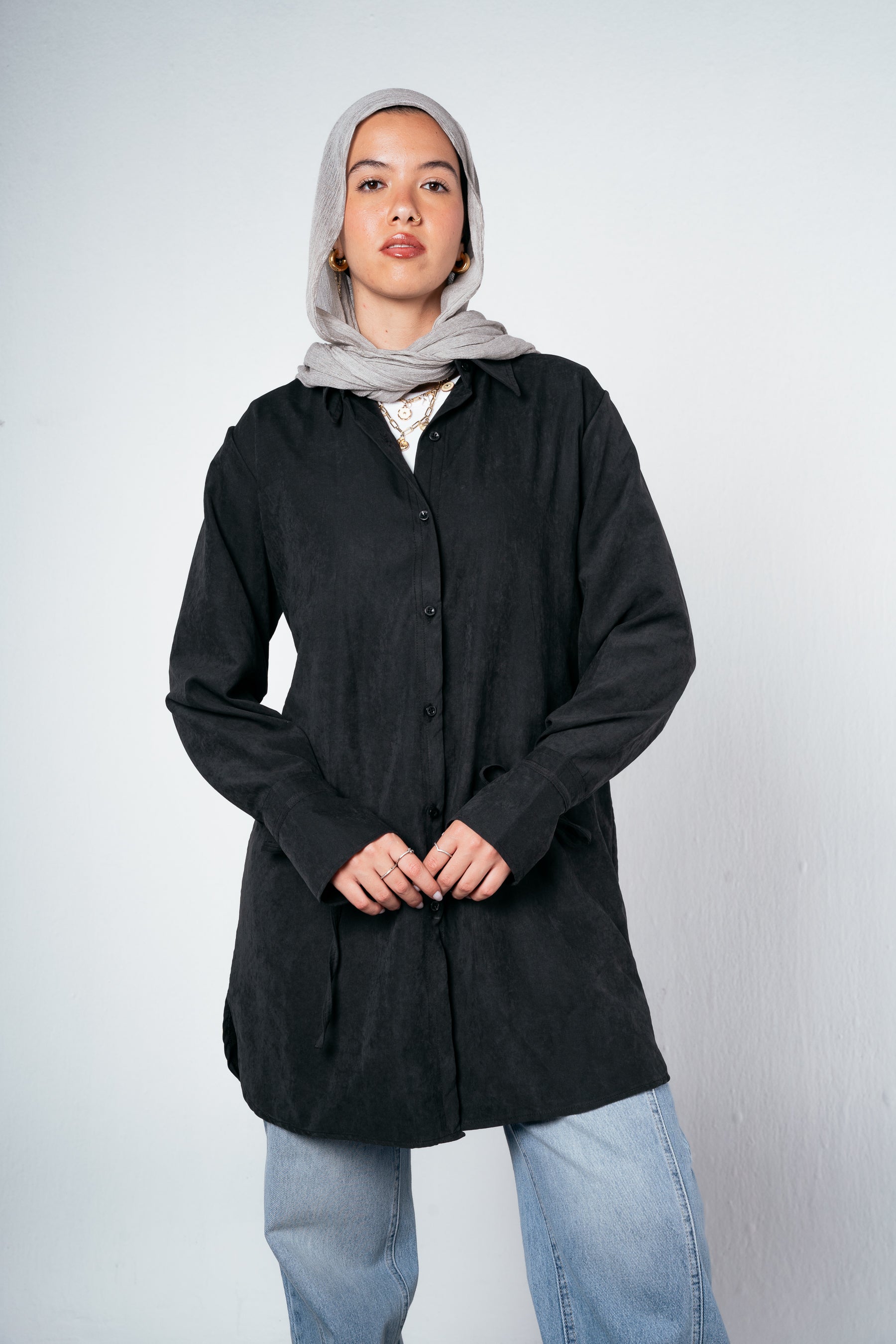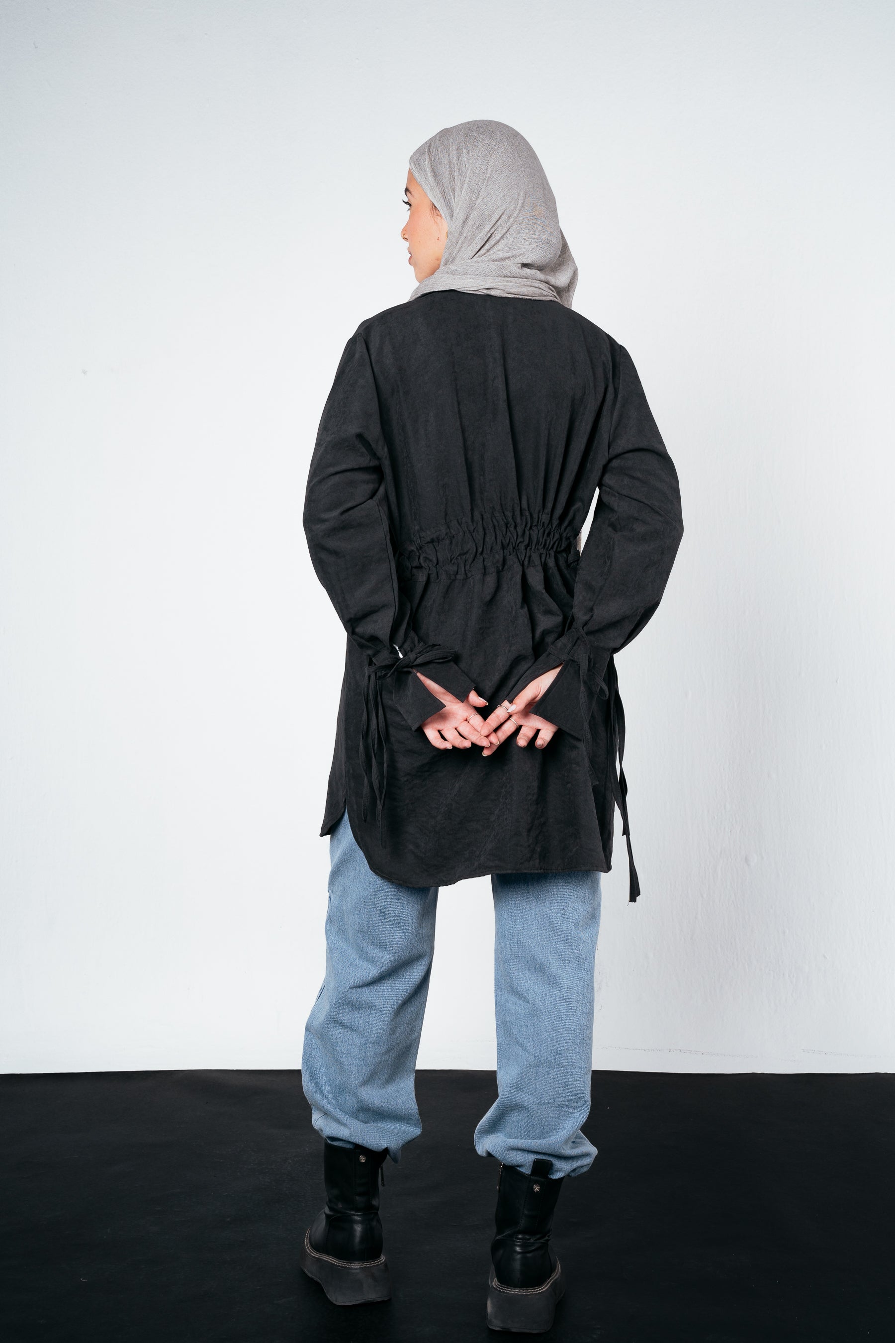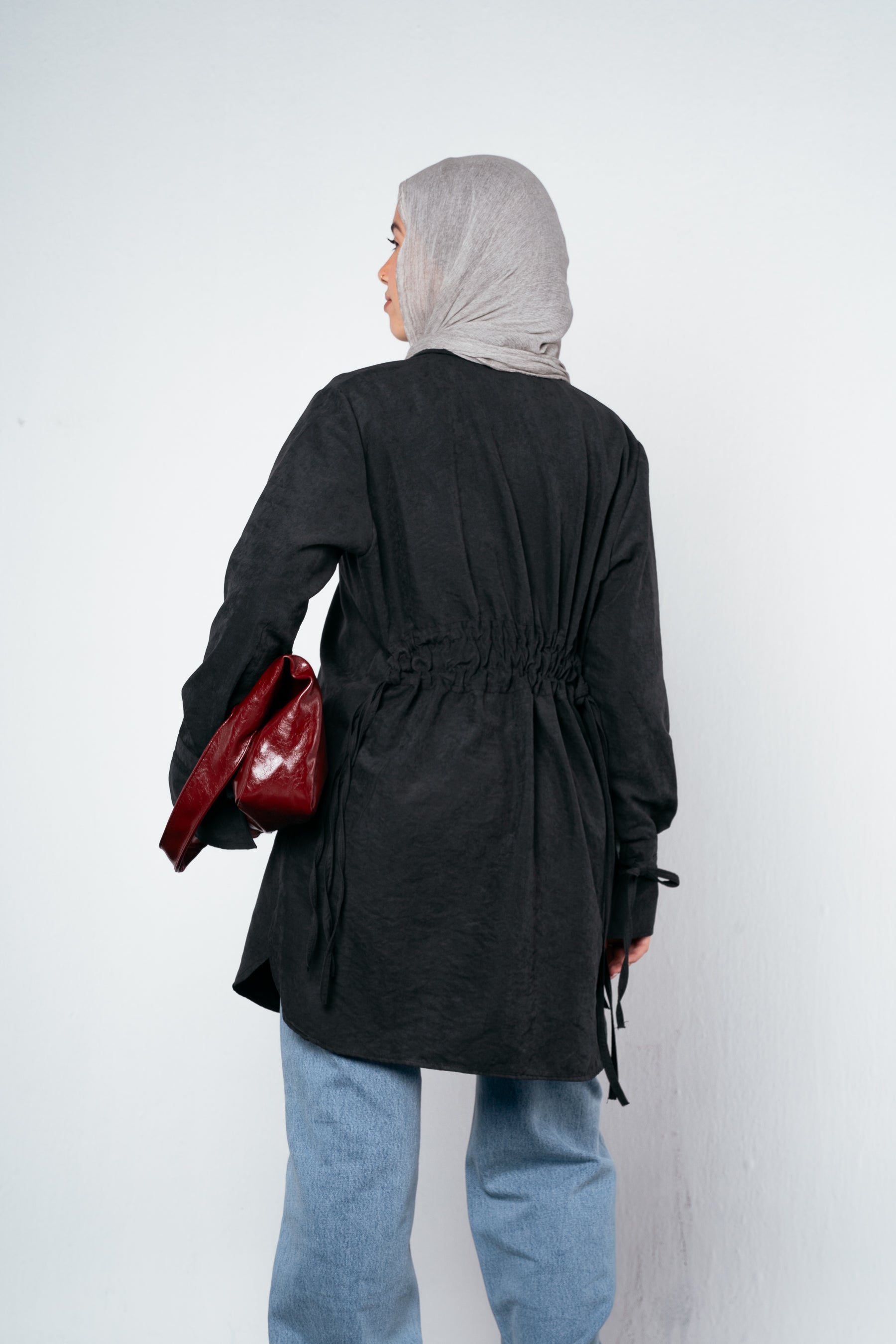 Meet your new statement shirt for fall — light, fluid, and full of character. Designed with an eye-catching sleeve cut and finished with triple drawstrings at the back, it blends comfort and creativity in one chic silhouette. Perfect for layering or standing out on its own.